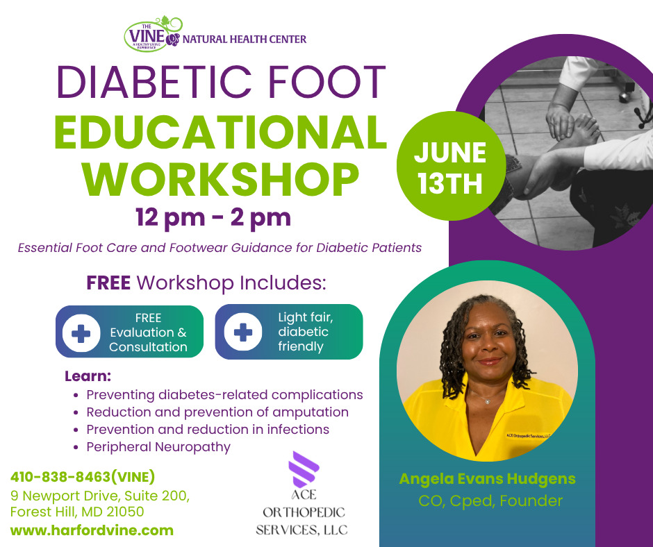 Join The Vine Natural Health Center and ACE Orthopedic Services, LLC for an informative and essential workshop dedicated to diabetic health and wellness. Led by Angela Evans Hudgens (CO, Cped, Founder), this event offers professional guidance on foot care and footwear specifically designed for diabetic patients.