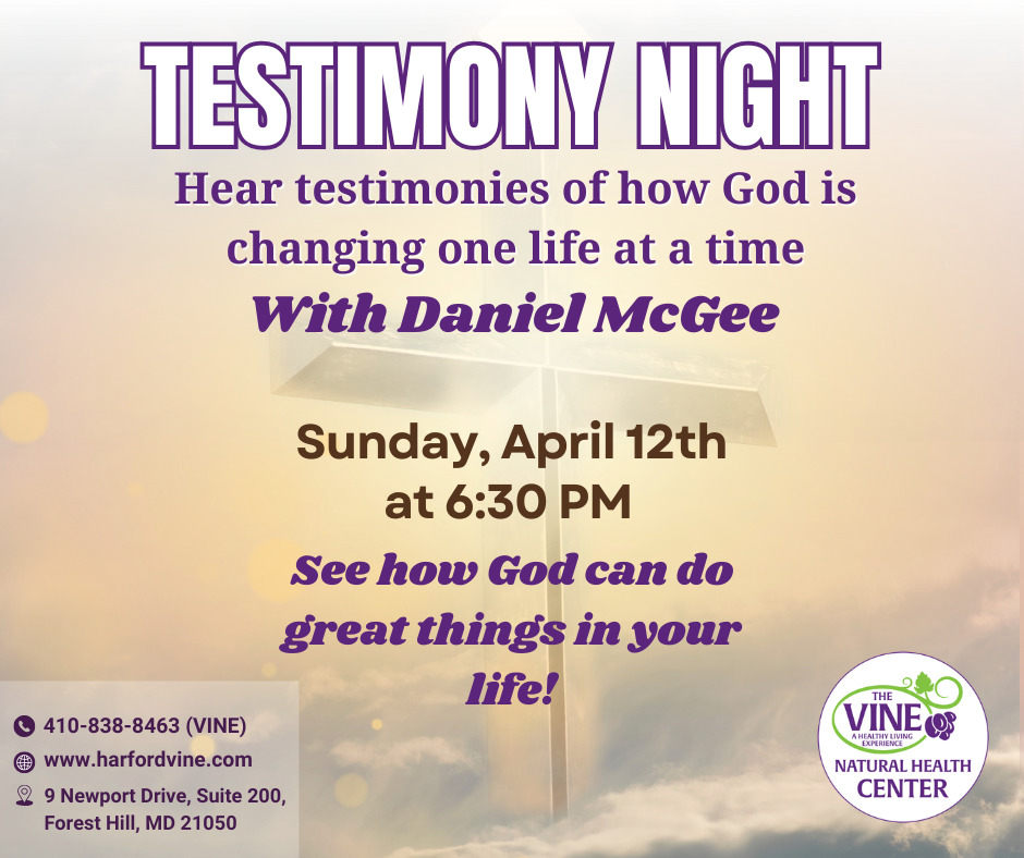 “Testimony Night” is a community event series at The Vine Natural Health Center on Sunday, April 12th at 6:30 PM. This special evening, and every second Sunday of the month, is dedicated to sharing inspiring stories and hearing firsthand accounts of how God is making a positive impact on people’s lives. It’s a powerful opportunity to witness the transformative changes happening in the community and to be reminded of the strength of faith.