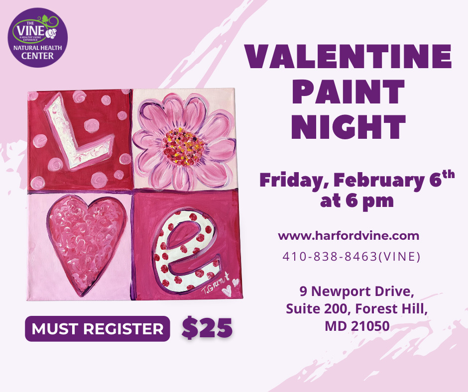 Join us for a fun and creative Valentine Paint Night at The Vine Natural Health Center! 💜🎨